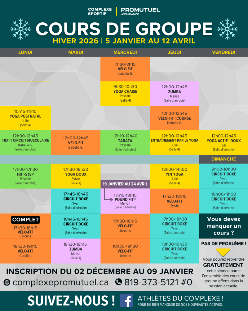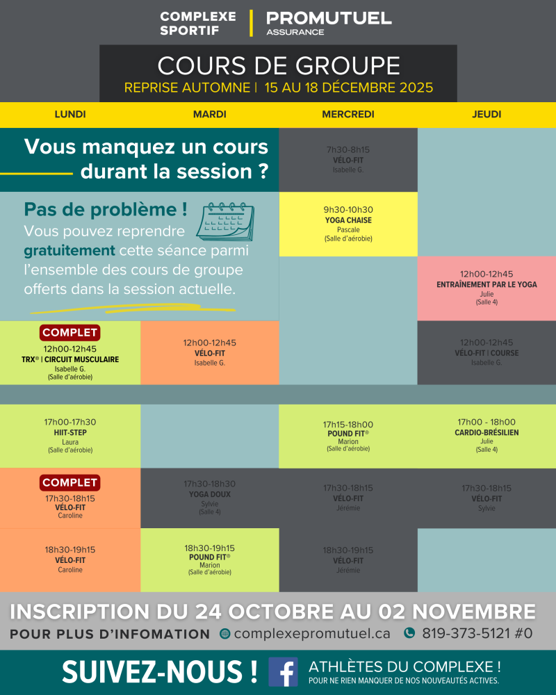 Veuillez prendre note que les cours complets affichés sur l’horaire officiel demeurent non accessibles « À la fois ».