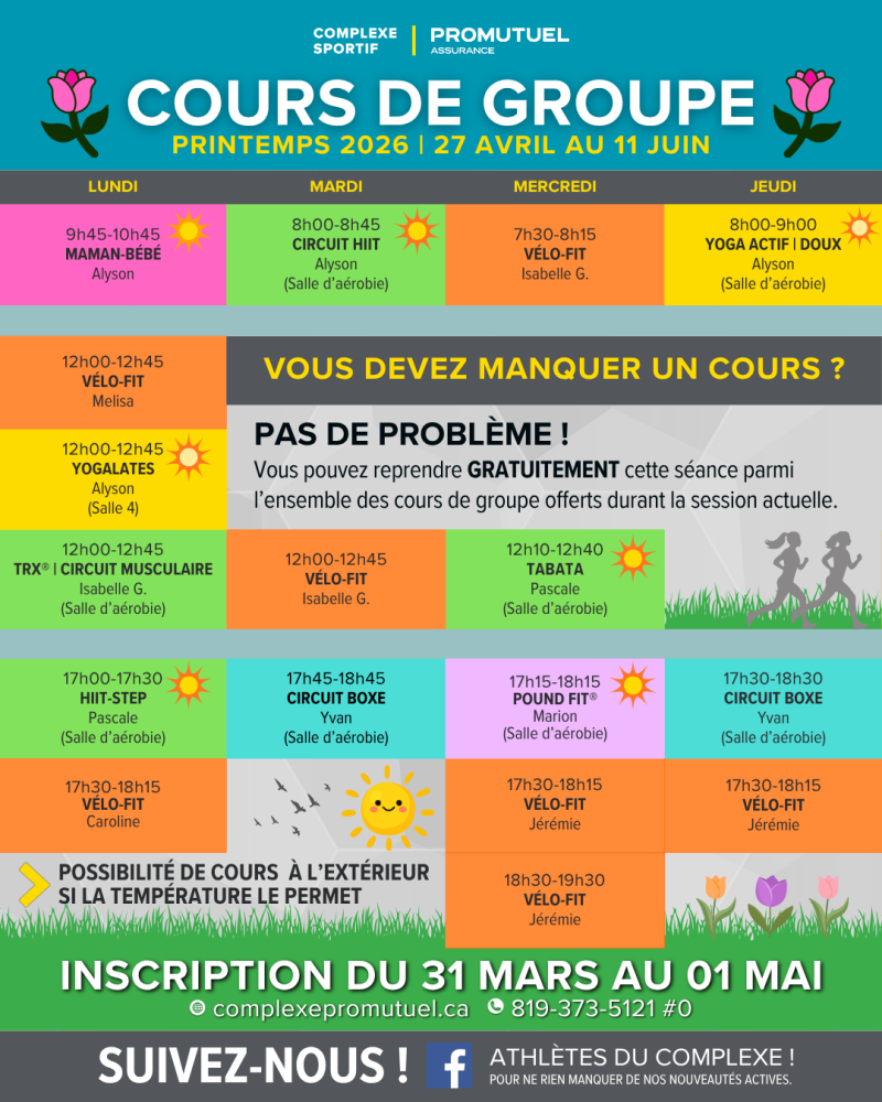 Du 27 avril au 11 juin, Participez à nos 7 semaines de cours de groupe dans une ambiance motivante !